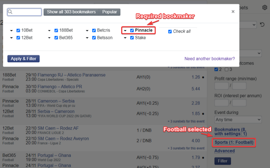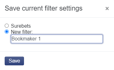 Ayrıca, birden fazla filtreyi tek bir çoklu filtrede birleştirmek de mümkündür. Bu, Kesin Bahisler, Ortalamalar ve Değer Bahisleri için daha karmaşık bir arama yapmak için güçlü bir araçtır. Örneğin, Kesin Bahisler'de sadece Bahis Şirketi 1 (varsayalım ki Pinnacle) için futbol bahislerini ve diğer bahis şirketlerinin tüm spor bahislerini görmek istersiniz. Bu hedefe ulaşmak için, önce Bahis Şirketi 1 için ayrı bir filtre oluşturun ve bunun zorunlu olmasını sağlayın, futbol ise tek spor olsun.